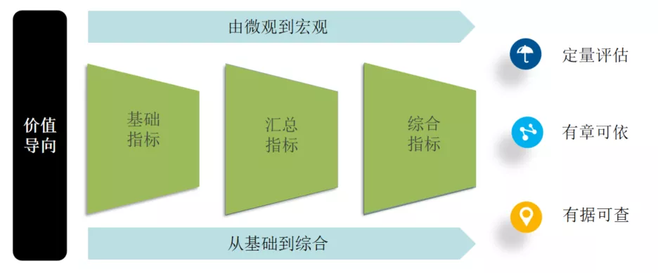 其次,“基礎指標、匯總指標、綜合指標”三層的數據加工流向是:從已有系統中提取和加工基礎指標、從基礎指標加工出匯總指標、然后為全面描述資產價值引入權重并加工出綜合指標。完全實現從綜合指標穿透到匯總指標、基礎指標直至現有系統的場景,使得數據資產價值的取值有源可查、有據可查。針對行業的不同,我們定義了一系列的基礎指標、匯總指標和綜合指標體系。