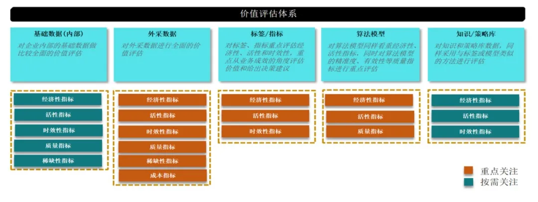 企業數據資產按照使用場景可以分為內部基礎數據類、外采數據類、標簽/指標類、算法模型類以及知識/策略庫類等,結合不同數據資產的適用場景和特性差異,企業需要制定差異化的價值評估方法。如對標簽/指標類數據資產重點從業務成效的角度評估經濟性、活性和時效性等價值,算法模型類數據資產除了經濟性和活性評估之外,還需要對模型算法的精準度、有效性等質量指標進行重點評估,而對于動輒每年百萬或千萬級別采購的外采數據類資產則需要特別關注成本評估及經濟性評估。