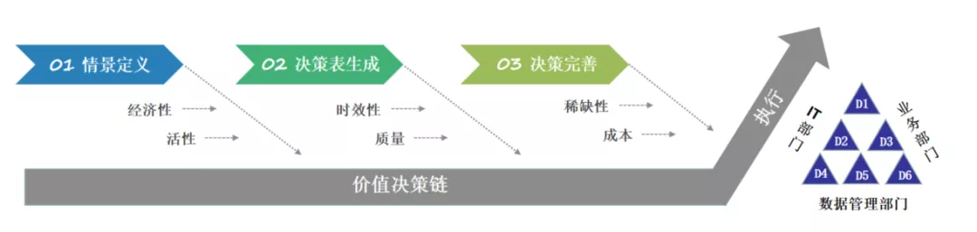 決策鏈不僅要生成決策建議,更重要的是關注決策的執行和結果反饋。數據治理的核心主體包括數據擁有者(通常是各業務部門)、數據管理者(通常是數據管理部門)以及數據維護者(通常是IT部門)。相應地,數據資產運營絕不僅是數據管理部門的任務,IT部門和業務部門同樣承擔著重要的責任。不同決策建議下各部門間均需要明確各自任務并貫徹執行,這樣才能達到真正意義上的數據資產共建、共享、共贏。