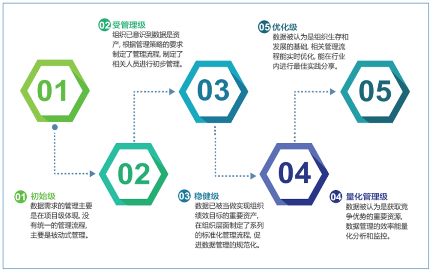 DCMM將數據管理能力成熟度劃分為五個等級,自低向高依次為初始級(1級)、受管理級(2級)、穩健級(3級)、量化管理級(4級)和優化級(5級),不同等級代表企業數據管理和應用的成熟度水平不同。
