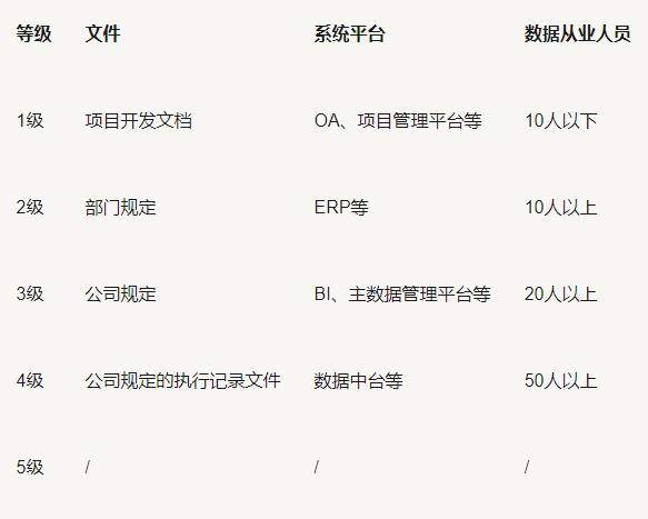 DCMM評估包含的內(nèi)容也非常多,這里只能通過一些內(nèi)容做一個簡單的判斷(由于DCMM是向下兼容的,所以申請高等級的評估同時需要滿足低等級的要求)。