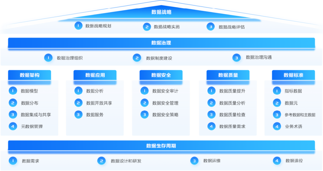 數據資產管理行使權利和控制的活動集合,數治理涉及到數據管理的組織、標準規范、流程、架構等多個方面。數據管理的其他關鍵過程域都有交互,數據治理是在高層次上制定、執行數據管理的制度。數據治理能力域包括數據治理組織、數據制度建設、數據治理溝通三個能力項。