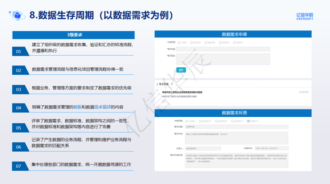 數據生存周期在DCMM作為了一個單獨的能力域,是一個動態管理數據的能力域,從數據的需求出發應該能夠為用戶提供數據需求申請的入口,為了方便或者說保障供需雙方的理解一致還應該提供需求模板,需求滿足后的跟進反饋,確認供方提供的需求達到了需方的要求,形成閉環。
