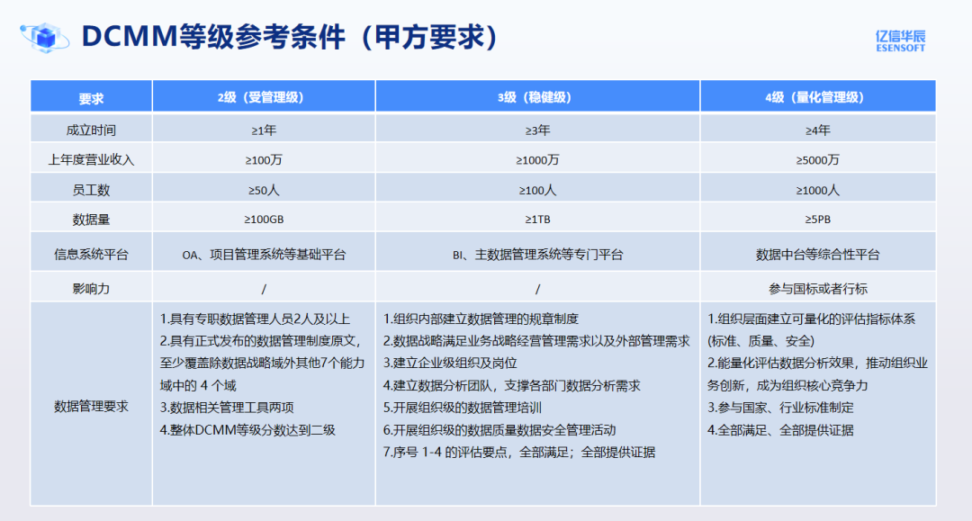 元數據管理為例,DCMM3級要求是組織級的元數據管理,有元模型要求、建立元