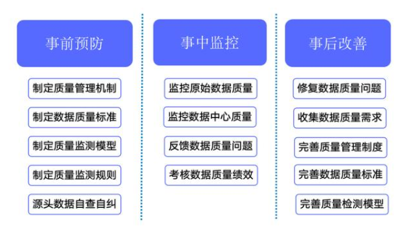 了解了數據質量后,再說說什么是數據質量管理。數據質量管理是一個集方法論、管理、技術和業務為一體的解決方案,是一個不斷循環的管理過程。一方面反映出數據質量的重要性以及數據質量工作的零散性和瑣碎性;另一方面也反映出數據治理是一個相對漫長的過程。簡而言之,數據質量管理是對數據在每個階段里可能引發的各類數據質量問題進行識別、度量、監控、預警等一系列管理活動,并通過改善和提高組織的管理水平確保數據質量的提升。