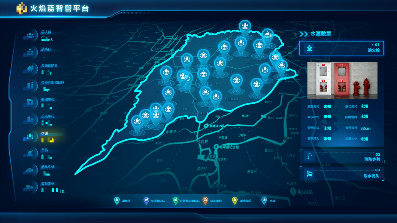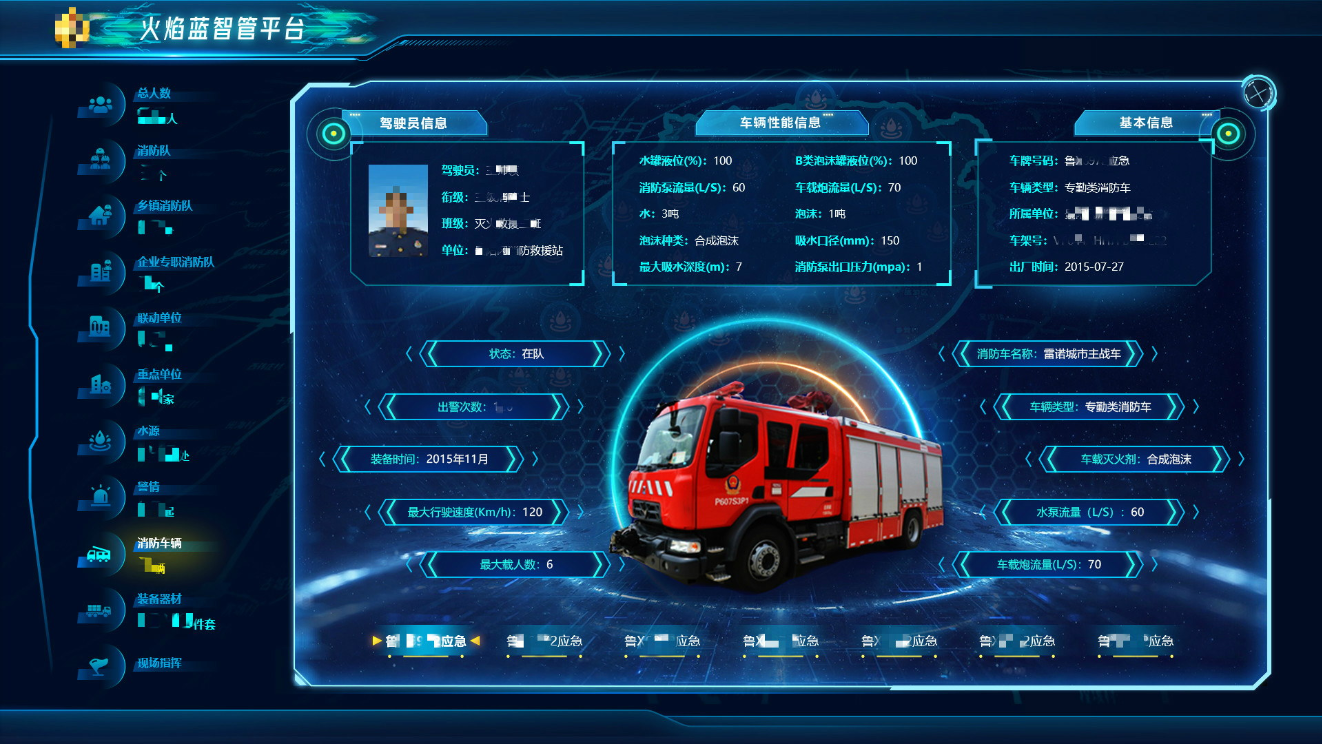 運用文字、羅馬數字和統計圖相結合的方式,展示消防隊、消防救援站當前總人數、企業專職消防隊、鄉鎮消防隊、重點單位、聯動單位、警情、水源、裝備器材、消防車輛、現場指揮現狀等KPI,實現數據鉆取聯動、掌握實時數據和最新視頻內容。
