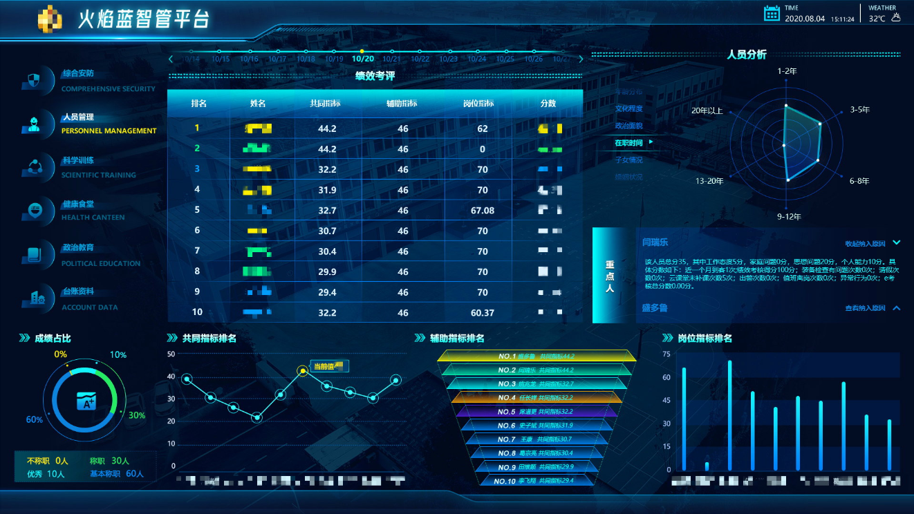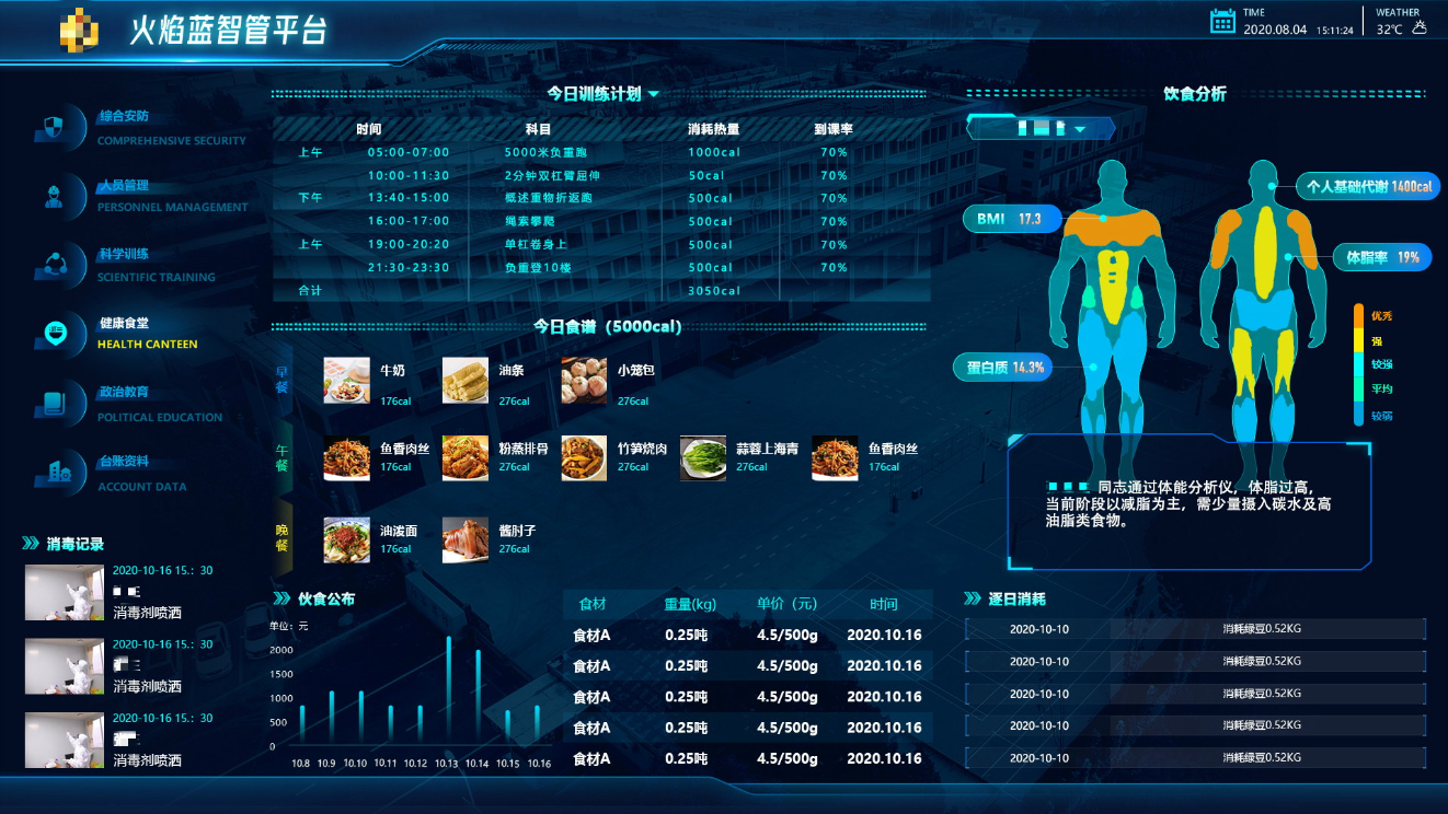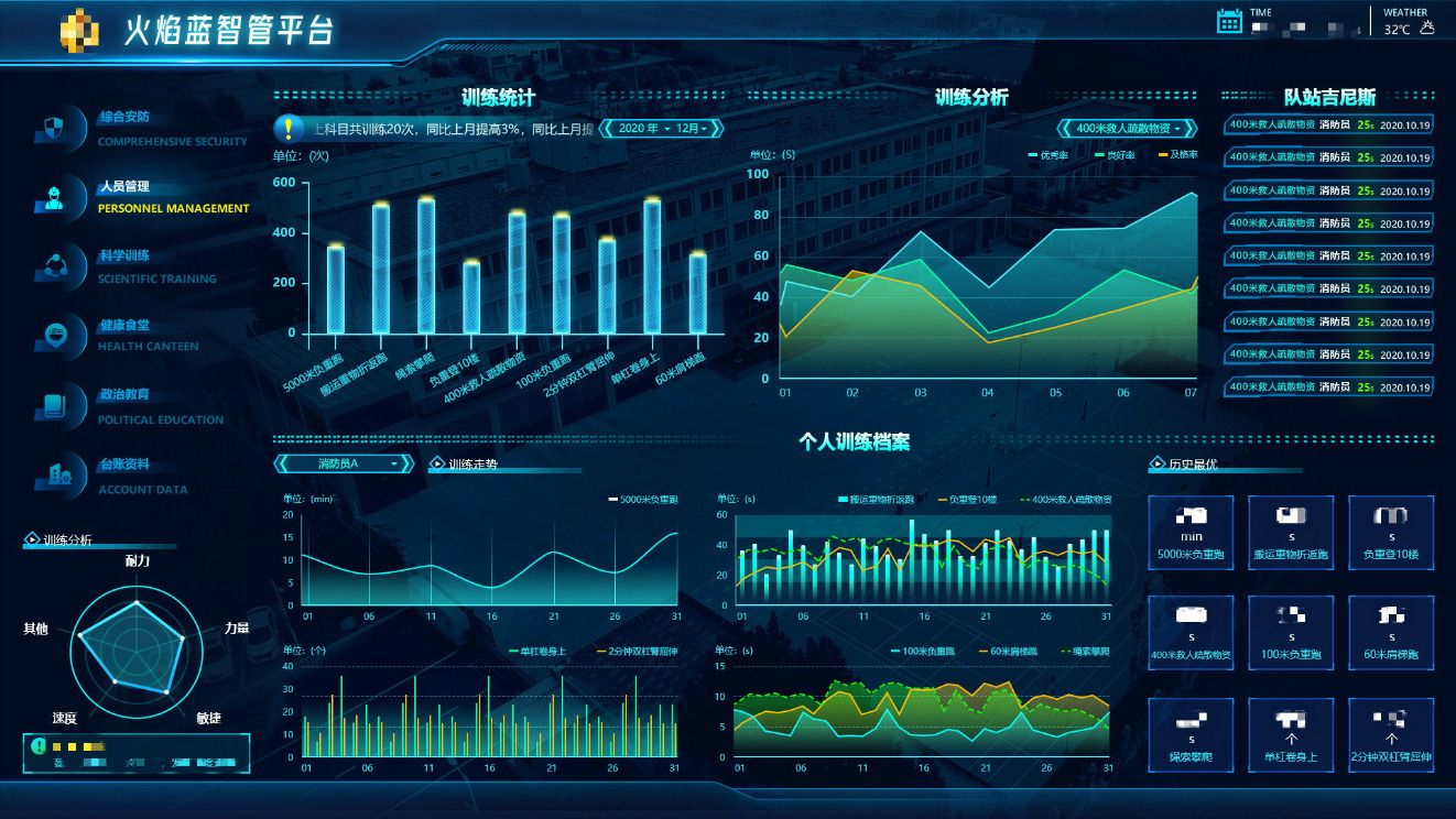 在服務消防救援隊站的過程中,根據分析展示需求,結合數據調研情況,設計清晰的故事線。故事線設計緊扣消防救援業務,讓展示受眾能夠清晰體會到消防救援站基本情況以及消防救援隊員、隊站、食堂、訓練等管理情況,讓事務活靈活現、使參觀者身臨其境。