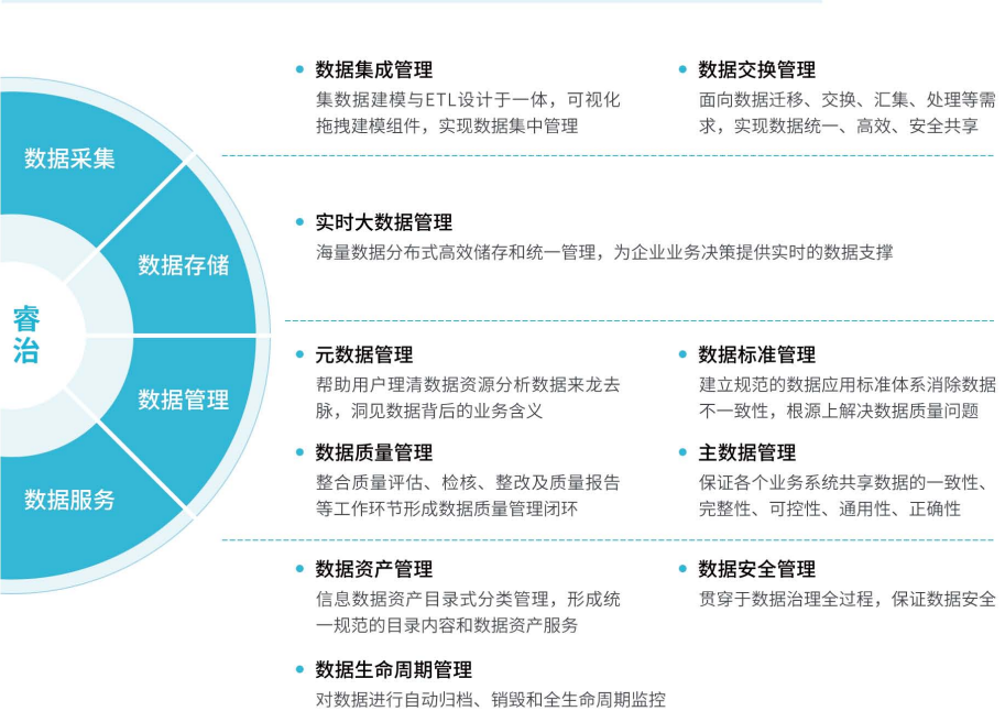 1)數據治理:含數據治理十大模塊。睿治智能數據治理工具由億信華辰自主研發,融合實時計算存儲、數據集成管理、數據交換管理、實時計算存儲、元數據管理、數據標準管理、數據質量管理、主數據管理、數據資產管理、數據安全管理、數據生命周期管理十大產品模塊,各產品模塊可獨立或任意組合使用,打通數據治理各個環節,可快速滿足政府、企業用戶各類不同的數據治理場景。