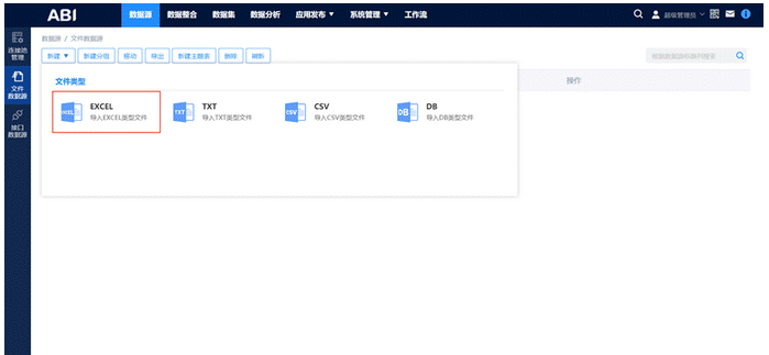 在數據源模塊的“文件數據源”下,點擊“新建”,選擇“Excel”數據庫(這里以Excel文件為例,其他文件操作相同)