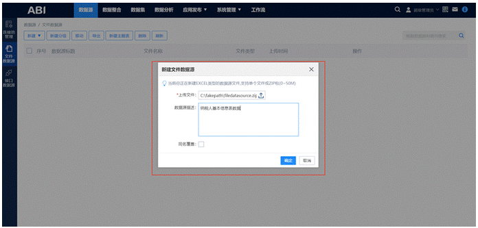 點擊“EXCEL”之后會彈出“新建文件數據源”對話框,在對話框中上傳需要的EXCEL文件數據源,并填寫描述信息。